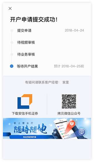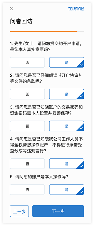 4、完成问卷 提交申请:完成开户问卷调查,提交开户申请,等待开户结果短信通知